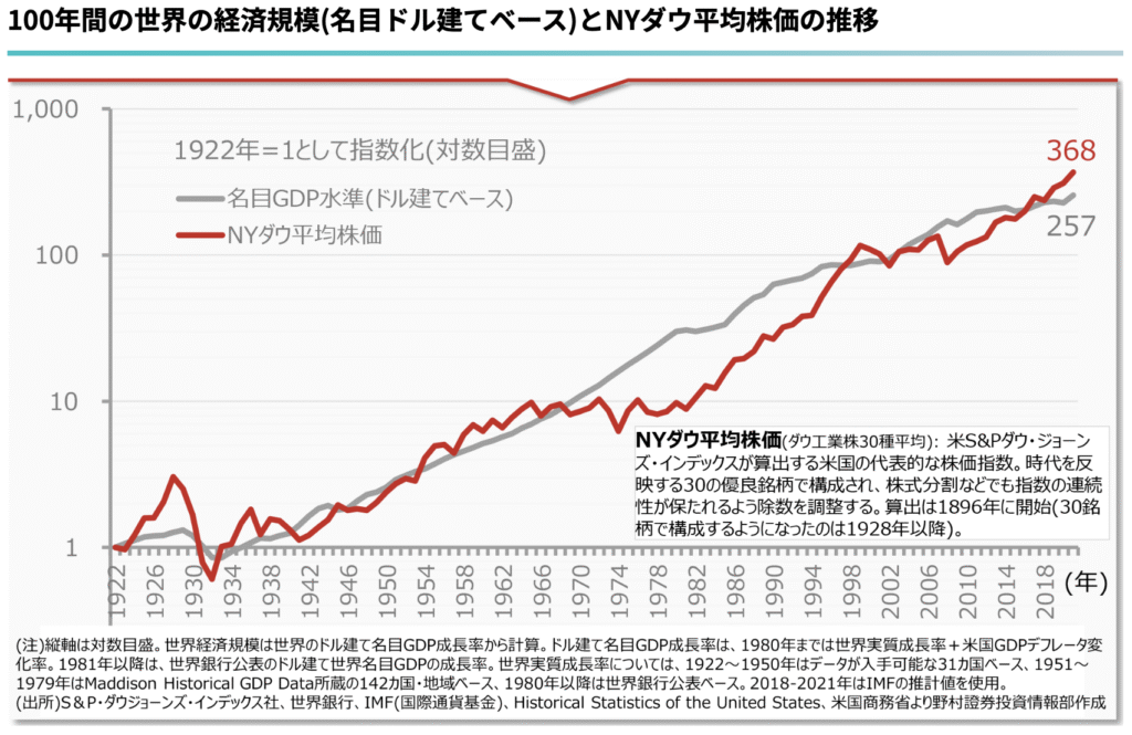 こちらは野村ホールディングス(株)が作成した1922年から100年間の世界の名目GDPと米国の株価指数・ダウ平均のグラフです。100年単位で見ると、確かに経済の成長と株価が連動していることがわかります。長期という場合には、最低でも100年単位で株価の動きを見るべきではないかと思います。
