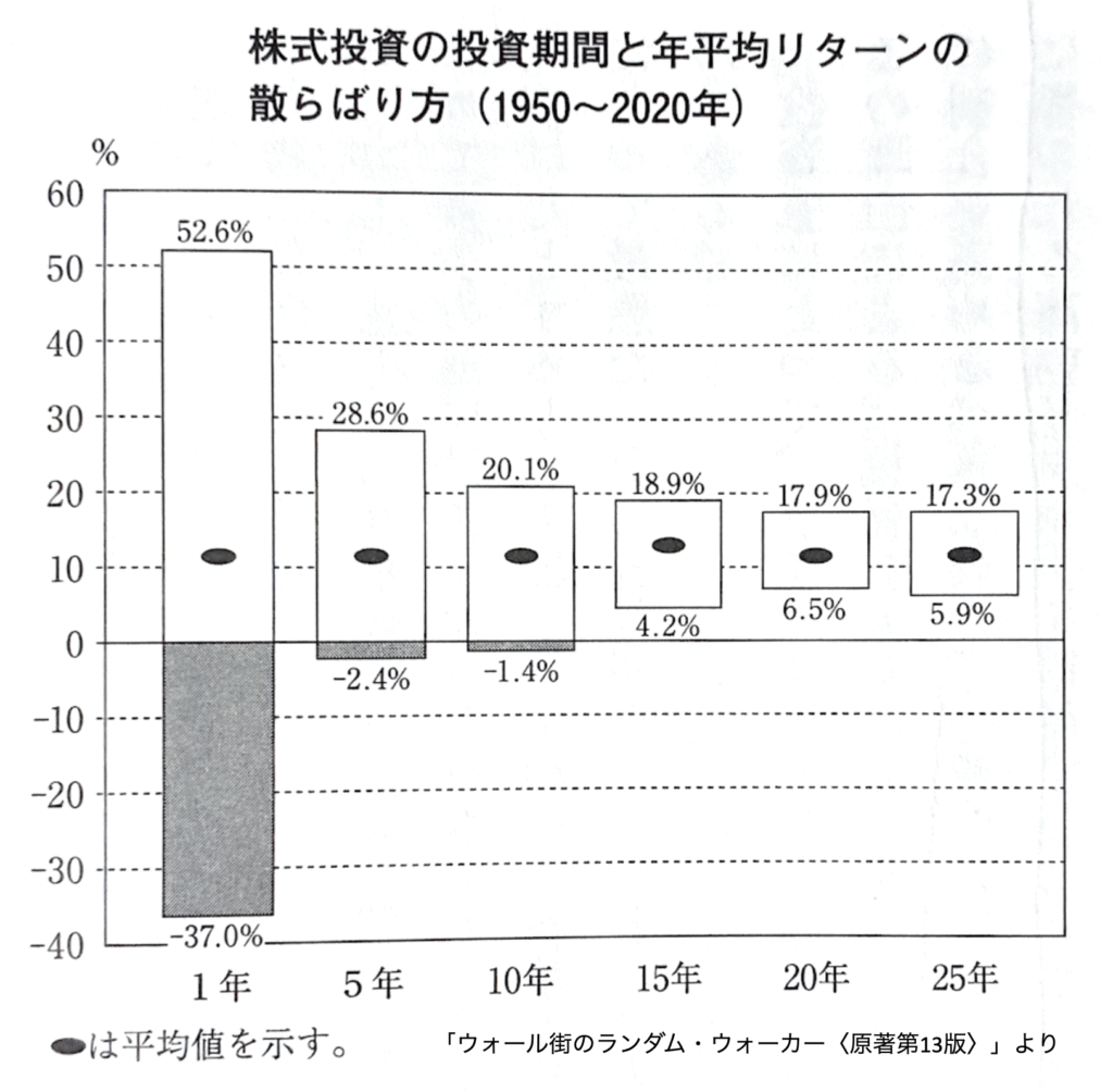 続いてこちらは、株式に投資した場合の「最高の結果」と「最低の結果」のばらつきを1950年から2020年で調べたグラフです。投資期間が15年を過ぎると、最低の結果でも投資のリターンがプラスに転じるのがわかると思います。つまり、株式投資は投資期間が長いほどマイナスのリスクが減少するのです。