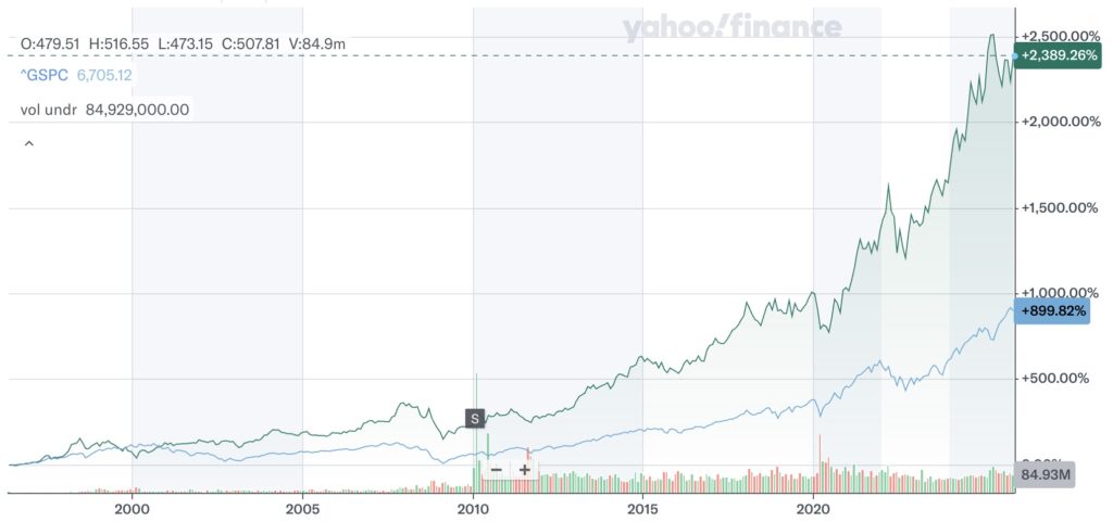 バフェットの凄さの代表例は、1965年にバークシャーの経営権を握ってから2015年までの約50年間に株価を2万倍にしたこと。この間、S&P500の上昇率は140倍でした。以下のグラフは直近30年の株価をS&P500と比較したものですが、これだけ見ても彼の凄さがわかります。