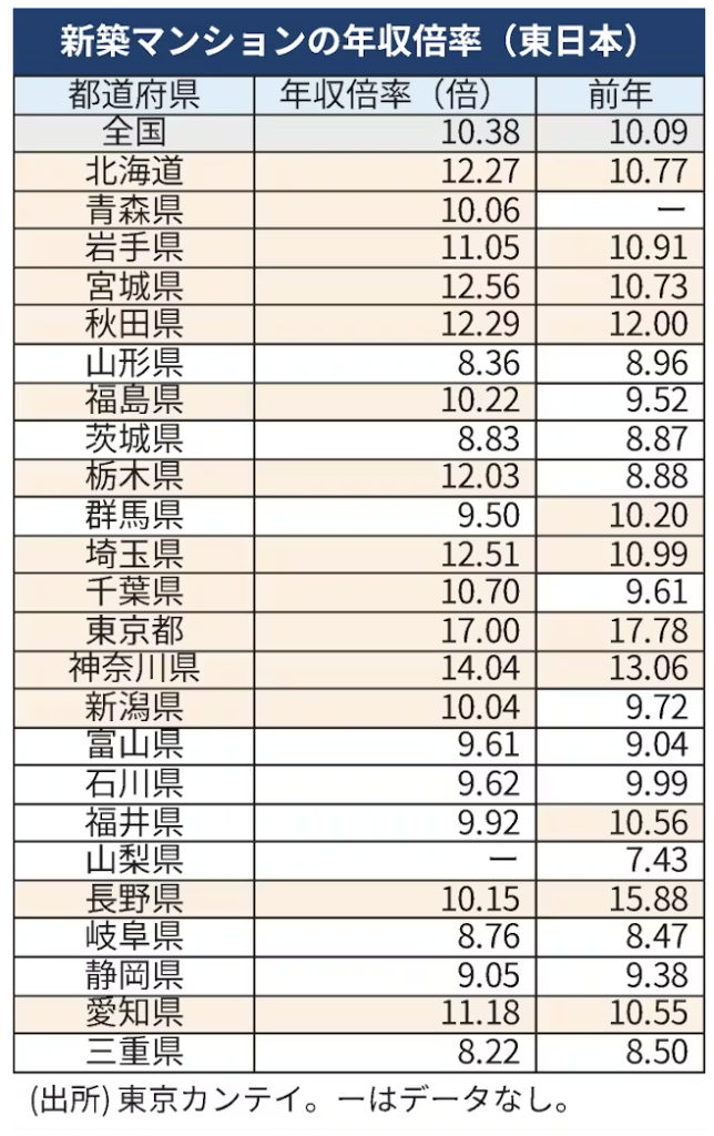 全国の過半に当たる24の都道府県で新築マンションの価格が年収の10倍を超えたという内容です。東京都にいたっては17倍以上と新築マンションの購入は共働きでも相当難しくなってきました。