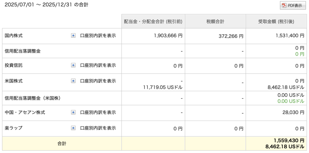 今回は2025年下期の配当・分配金の内訳をご説明しました。配当・分配金については定期的に状況をお知らせ出来ればと思います。ではまた!