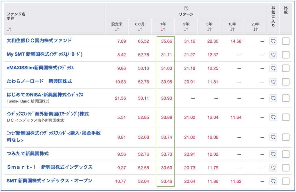 意外なことに、1位は国内株式、残る9つはすべて新興国株式のファンドになりました。皆さん大好きなオルカンは15位に「楽天・全世界株式(除く米国)インデックス・ファンド」(リターン:29.75%)が、S&P500は何と139位に「eMAXIS Slim米国株式(S&P500)」(リターン:15.66%)が入ったのが最上位でした。