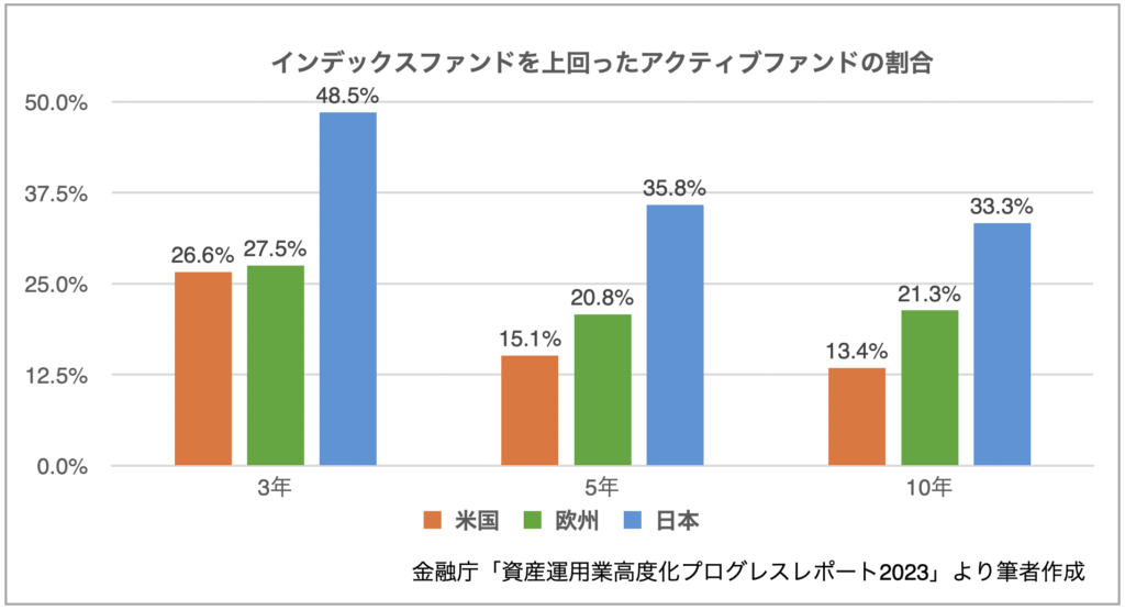 これは金融庁の資料から筆者が作成したグラフですが、10年間で市場平均であるインデックスファンドを上回ったアクティブファンドの割合は2〜3割しかありません。元々この資料は「だからインデックスファンドに投資するのが正解なんです」と言うためのものです。でも、何だかこれを見ると自分は市場平均を上回らなければならないような気になってしまいますね(笑)。