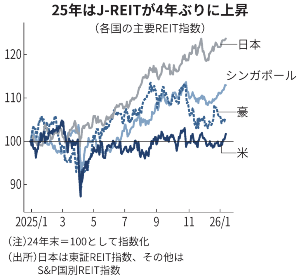 また、J-REITも5%以上の分配金利回りの銘柄が増えています。本来、金利上昇局面ではREITは売られやすいのですが、旺盛なオフィス需要を取り込んで収益も上がり、2025年から価格も上昇基調に転じています。「配当8割:成長2割」を狙うには良いタイミングかと思います。