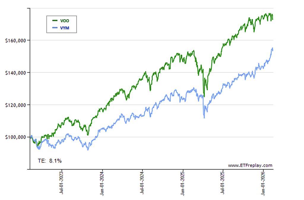 具体的な事例として、キャピタルゲイン型とインカムゲイン型の米国ETFをトータルリターンで比較してみましょう。キャピタルゲイン型はVOO(バンガード・S&P500 ETF)、インカムゲイン型はVYM(バンガード・米国高配当株式ETF)です。トータルリターンとは、キャピタルゲインとインカムゲインを合わせたリターンのことです。