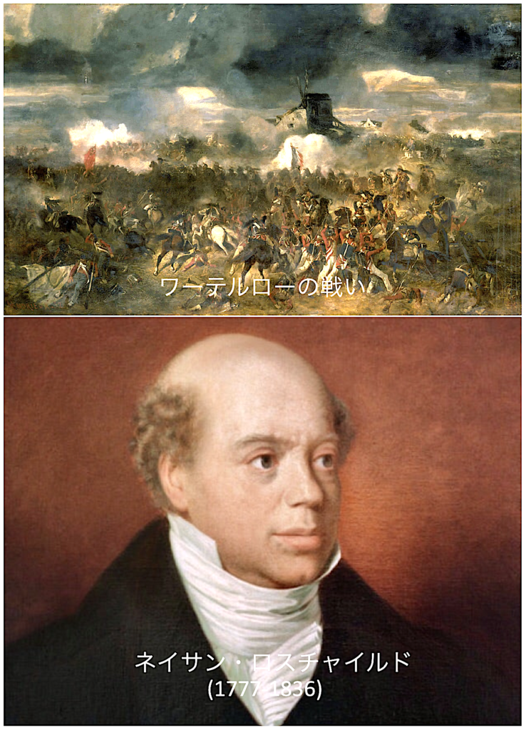 1815年、ナポレオン率いるフランス軍とイギリス・オランダ・プロイセンの連合軍によるヨーロッパの帰趨を決める戦いがベルギーのワーテルローで行われました。ネイサン・ロスチャイルドは、騎馬や伝書鳩という独自の高速通信網を使って「ナポレオン敗れる」の情報をいち早く入手。最初はあえてイギリス国債を売り浴びせました。周囲の投資家は「ロスチャイルドが売っているということは、イギリスは負けたに違いない」と思い込み、パニック売りで国債市場は急落しました。国債価格が底値に沈んだ瞬間、ロスチャイルドは態度を一変させ、大量のイギリス国債を買い集めます。国債価格はその後急騰し、ロスチャイルドは莫大な利益を得ることになりました。