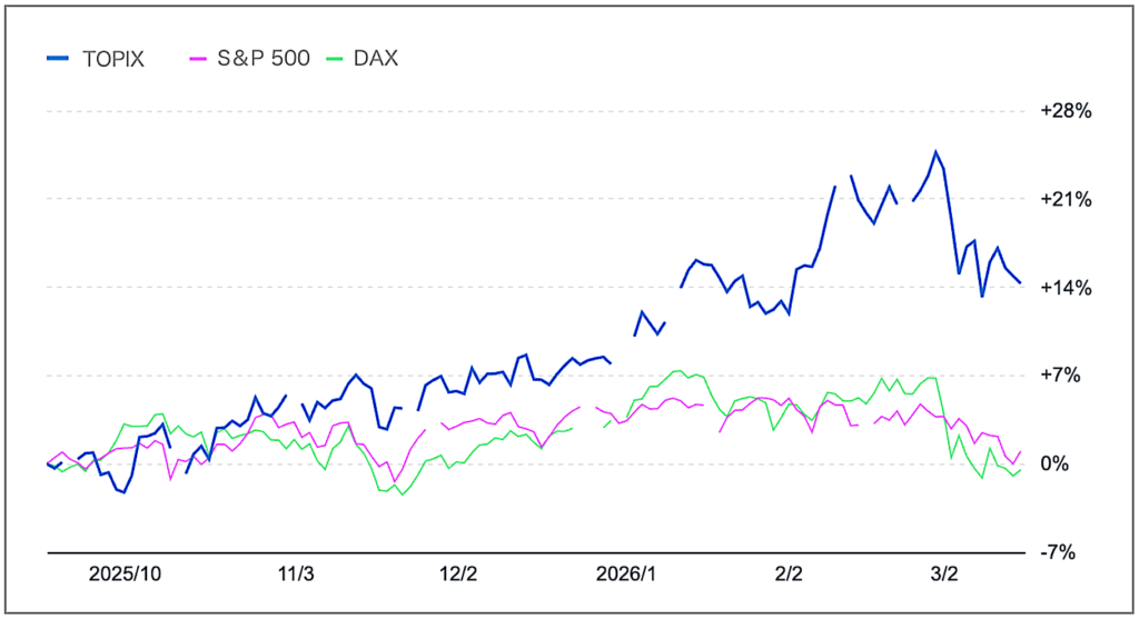 日本株はTOPIX、米国株はS&P500、欧州株はドイツのDAXで比べてみると、2025年のリターンが良かったTOPIXとDAXの下げが顕著でS&P500はそれほど影響を受けていないことがわかります。