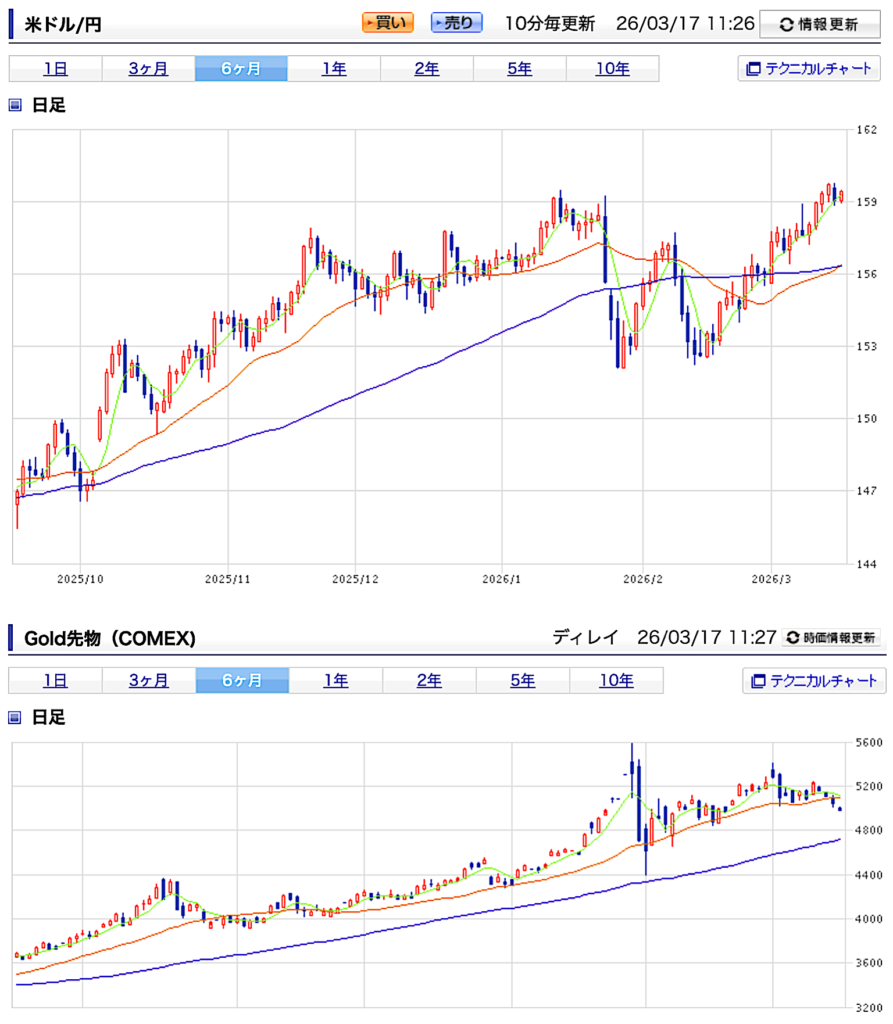 為替と金の動きです。ドル/円は今回の紛争発生直後からドルが買われて円安が進んでいます。金は紛争発生直後に売られ、時間が経過した後もやや値を下げているようです。