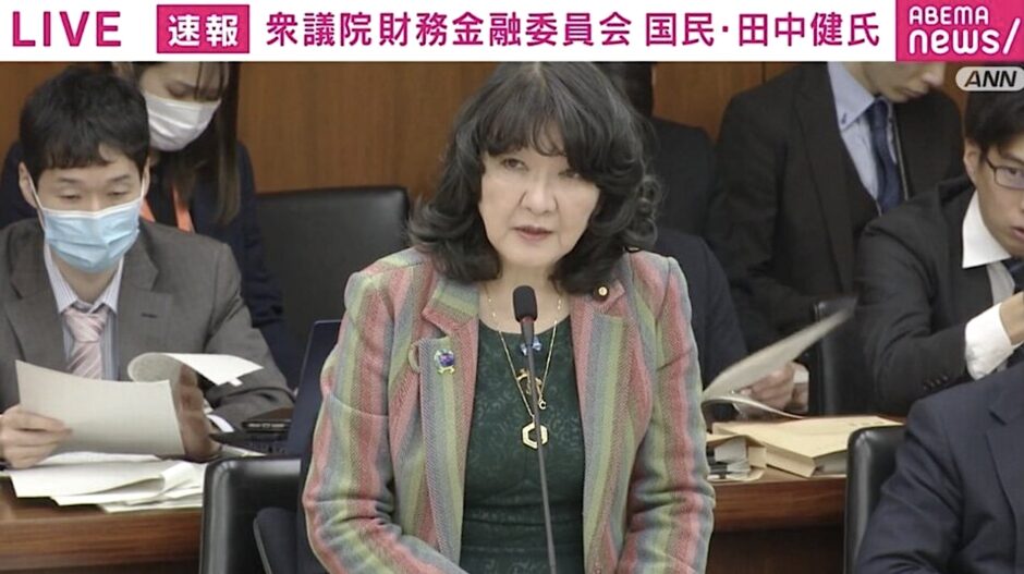 田中議員「NISA貧乏という言葉、お聞きになったことはありますでしょうか? 20代は投資額をすごく増やしているんですけど、消費は伸び悩んでいるそうです。漠然とした将来不安を抱えて20代、30代以下は75%が『公的年金には期待していない』。(中略)20代は投資も必要ですが、自分への投資、また様々な活動、いろいろなことをする大事な時期です。現状について、(片山)大臣の認識を教えて下さい。」