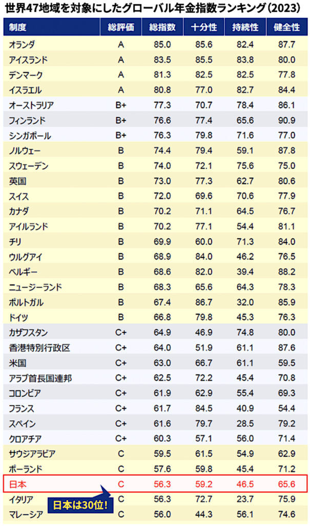 これは米国のコンサルティング会社マーサーと投資専門家の団体CFA協会が発表した「グローバル年金指数ランキング(2023)」です。世界47か国の年金を「十分性」「持続性」「健全性」の3つの基準で評価したものです。日本の順位は47か国中なんと30位。先進国の中でも順位が低い結果となっており、制度面で不安が残ることがランキングから読み取れます。3つの基準の中では特に「持続性」の評価が低く、国民の平均年齢が上がる一方で急速な少子化が進んでいることが不安視されているようです。
