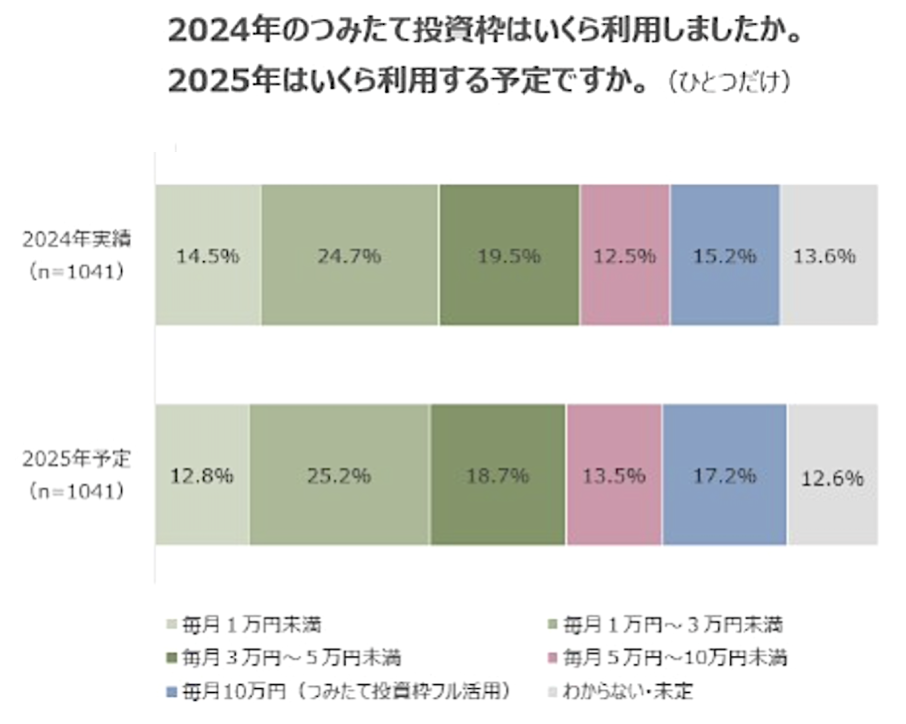 これはQUICK資産運用研究所が昨年10月に実施した「個人の資産形成に関する意識調査」からのグラフです。2024年に比べて2025年の方が全体として月々の積立額が増えていることがわかります。このうち最も増えたのが「毎月10万円(つみたて投資枠フル活用)」で2.0ポイント増です。好調な市場の影響でNISAの積立額は増加傾向にあることがわかります。