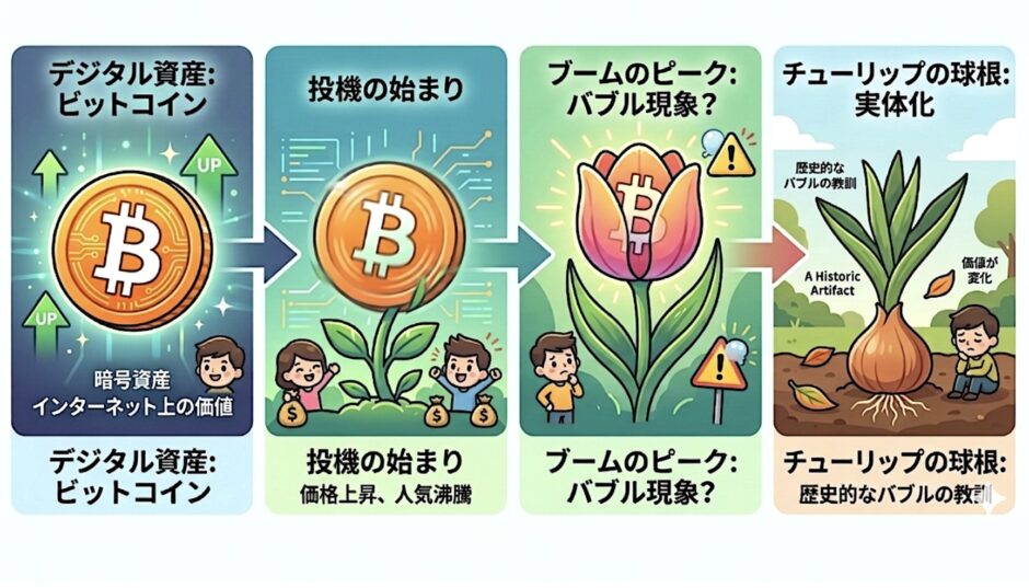 チューリップの場合は「その儲けで家を建てた」等の噂が飛び交い、市民がこぞって取引に参加しました。一方の暗号資産も「億り人」の登場や価格急騰のニュースで、20代〜30代を中心に市場参加者が急増しました。どちらも「自分も乗り遅れたくない」という心理が強く働き、価格の上昇に拍車をかけました。