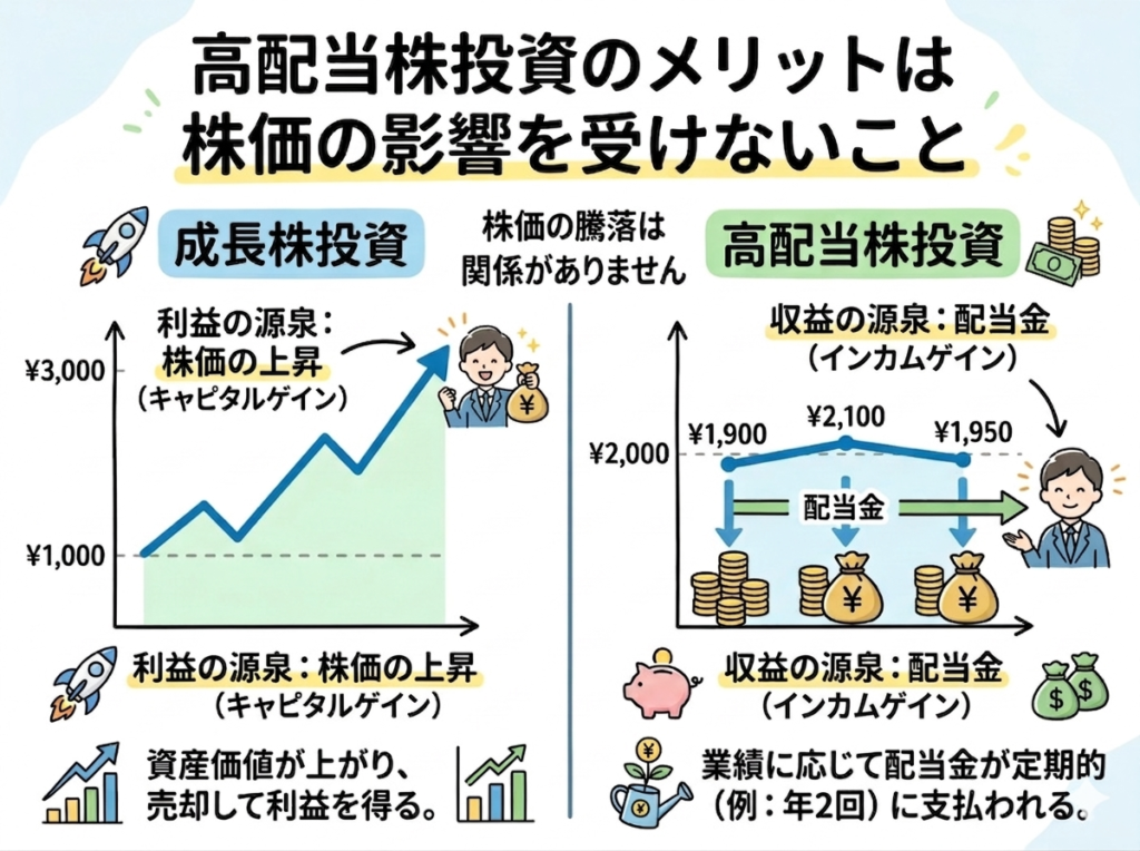 成長株投資の場合は、資産としての株価の上昇(キャピタルゲイン)が利益の源泉です。それに対して高配当株投資の場合は、企業が業績に応じて決める配当金(インカムゲイン)が収益になりますので、株価の騰落は関係がありません。