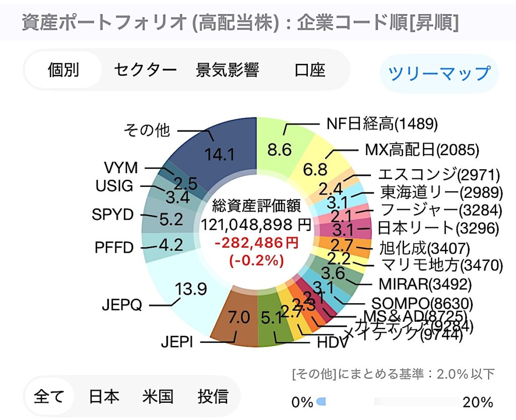 まず、持ち株の全体像です。大きく分けて「国内高配当株・ETF」「国内REIT」「米国高配当ETF」の3種類です。比率は「米国高配当ETF」が1/3よりやや多い状態です。「国内REIT」は人気が低迷している分、分配金利回りが良いためコツコツ買い集めています。最近の市況を受けて総資産評価額は0.2%のマイナスですが気にしません(笑)。むしろ、キャピタルゲイン狙いの銘柄よりは下落率は低いのではないかと思います。