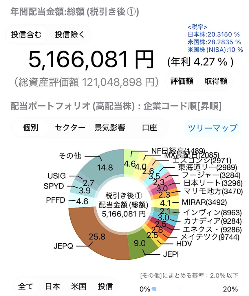 配当・分配金については税引き後の年額で516万円を超えてきました。現状の持ち株に応じて瞬時に年間の配当・分配金が計算できるのがこのアプリの優れた点です。年利は評価額に対して4.27%ですので、まずまずといったところでしょうか。比率で見ると、やはり米国高配当ETFのJEPIとJEPQが高いですね。特にJEPQの分配金の比率は全体の1/4を超えています。