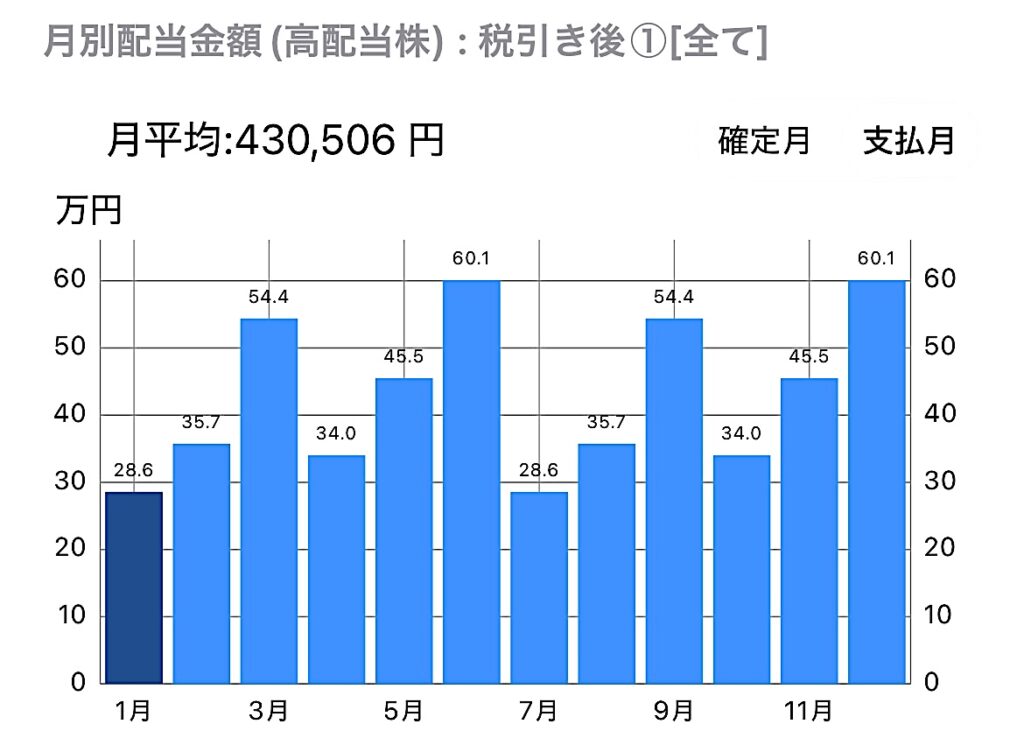 月別の配当・分配金も計算することが出来ます。毎月の収支を考える際にこの機能はとても役立ちます。グラフを見る限り、1月と7月の収益が少ないのでここを強化すべきなのが一目瞭然ですね。