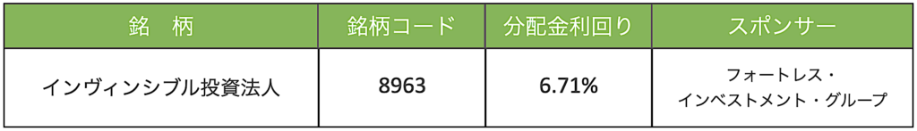 2004年に上場したホテルメインのREITです。コロナ後のインバウンドの回復により、業績も急激に好転。分配金利回り6.71%は現在国内REITで2番目の高さです。中国との関係悪化は若干気になるものの、その他の国からの外国人観光客がさらに増えれば、一層の業績向上が期待できます。