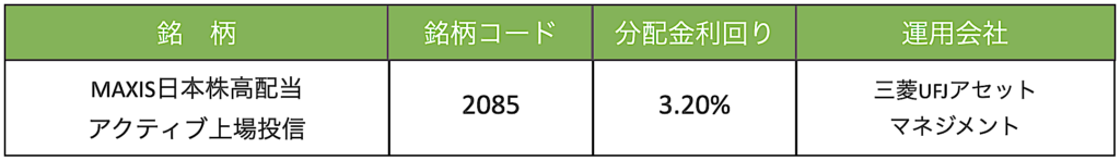 日本は米国に比べて高配当ETFの選択肢があまり多くありません。このETFは2023年上場と歴史は浅いながらも、そんな状況を打開すべく立ち上げられました。分配金利回りは3.20%と日本の高配当ETFとしては高い部類に入ります。ただ、ファンドマネージャーが銘柄を選ぶアクティブ型なので信託報酬が0.375%と高率であるのが少し気になります。