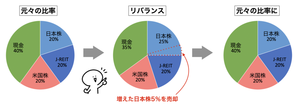 第2のきっかけは、リバランスでした。株式や投資信託と現金の割合を元々の比率を変えないように調整したのです。図解にすると以下のようなイメージです。