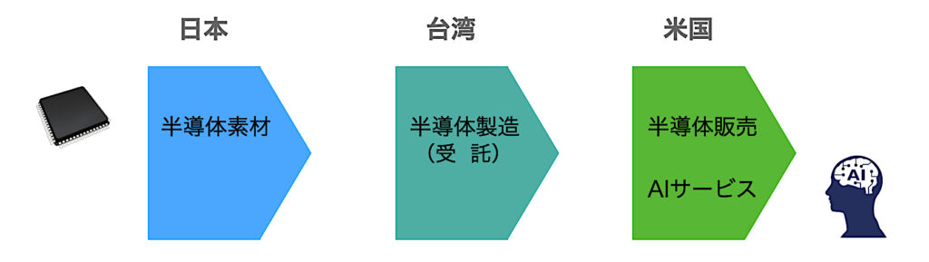 例えば、生成AIの根幹であるAI半導体を軸にAIサービスの世界的なサプライチェーンを図にすると、以下のようになります。